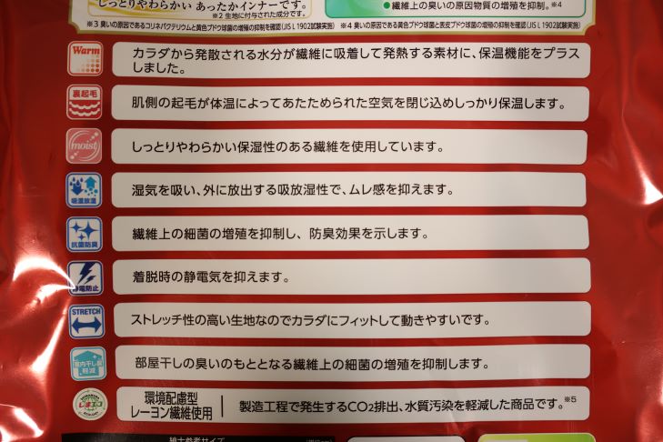 特に「暖かさ」と「静電気軽減」は個人的には非常に高ポイントで、インナーに求める物が同じ方にはおススメできる商品となっています。