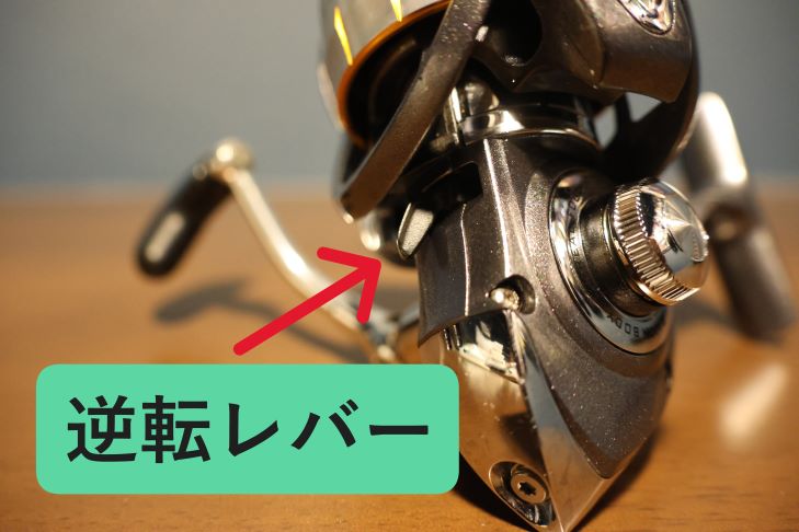 基本的にリールの巻く方向は手前から奥に向かっての一方通行ですが、逆転レバーをONにすると逆向きに巻けるようになります。