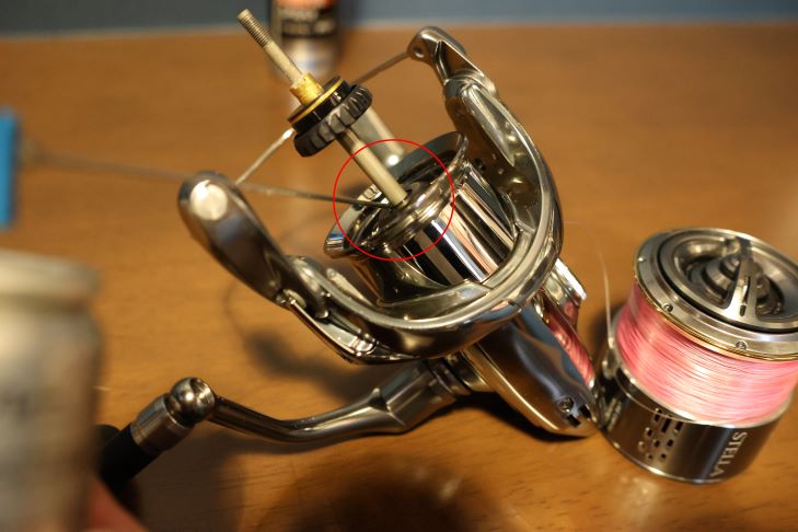 スプールを外してメインシャフトの軸にオイルを注油します。