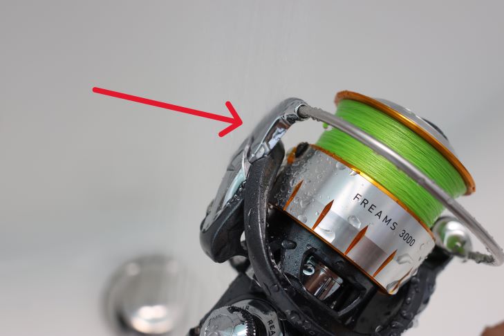 全体的に水をかけて優しく手洗いですが「ラインローラー」「ベールの付け根」「ハンドルノブ」「PEライン」は特に念入りに洗います。